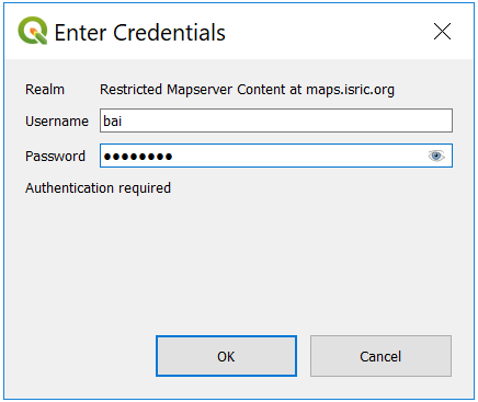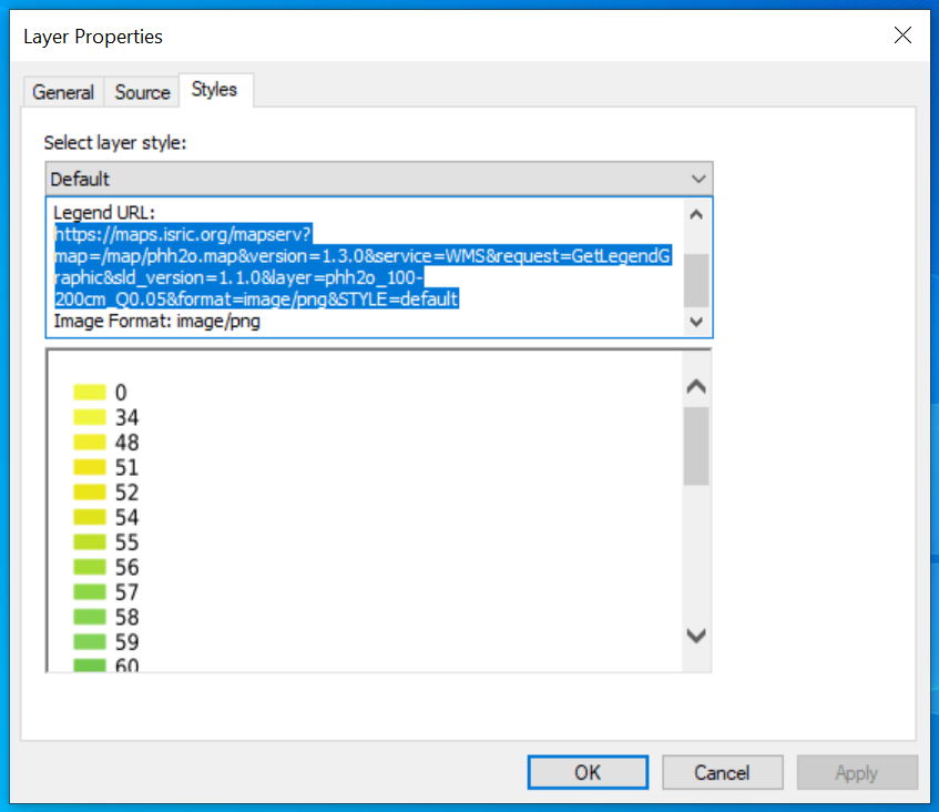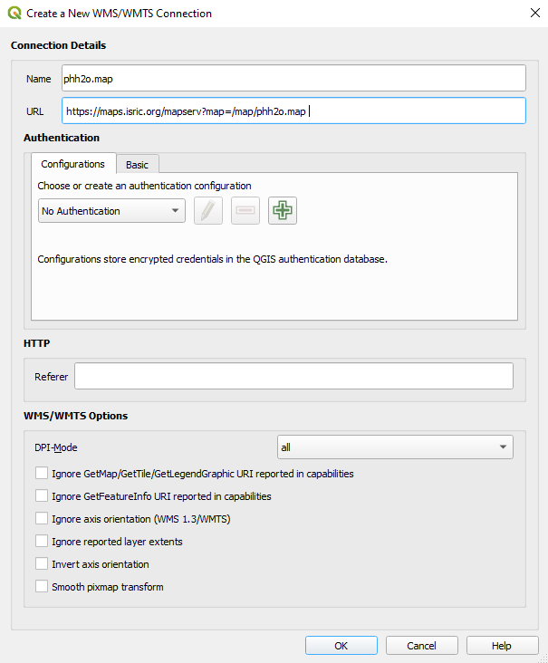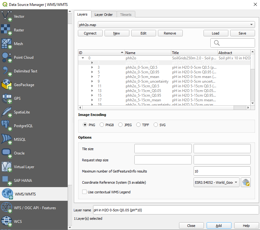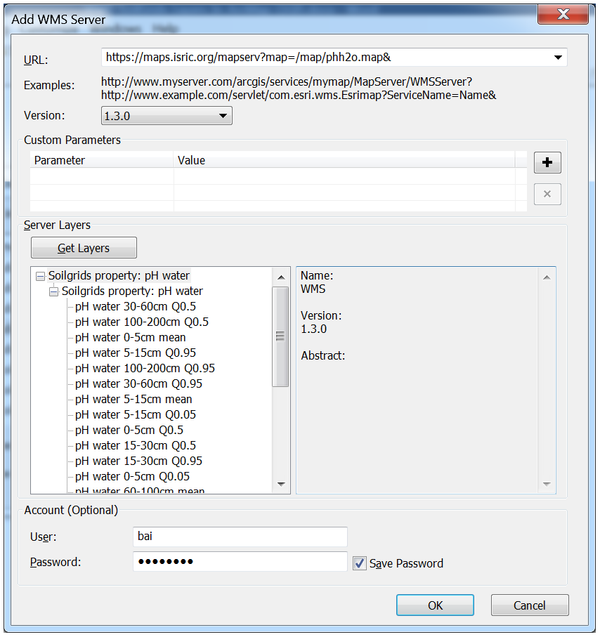 Fill in a Name and copy/paste a URL of a SoilGrids WMS in the URL box. For instance, fill in phh2o.map in the Name box, and copy and paste: https://maps.isric.org/mapserv?map=/map/phh2o.map in the URL box.