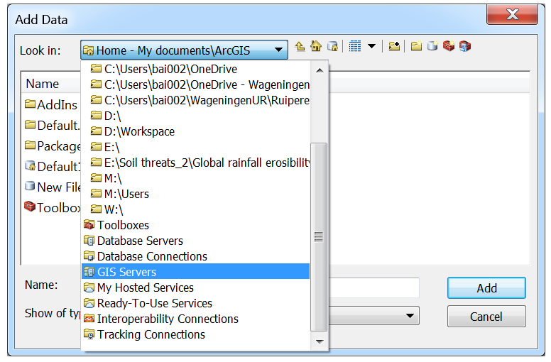 In the Add Data window, click the ‘Look in:’ drop down menu. Scroll down and double click GIS Servers.