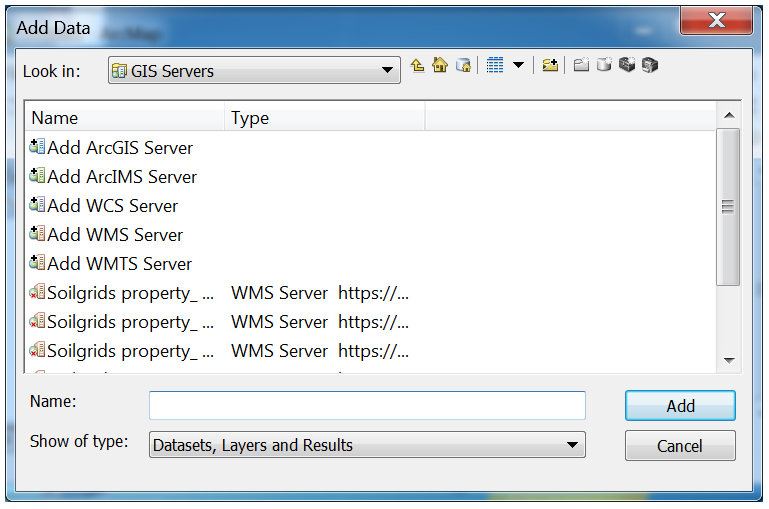 In the Add Data window you now see that this WMS is added to the GIS Servers folder. In the example of the pH-H2O layers the WMS appears as SoilGrids property_pH water in maps.isric.org.