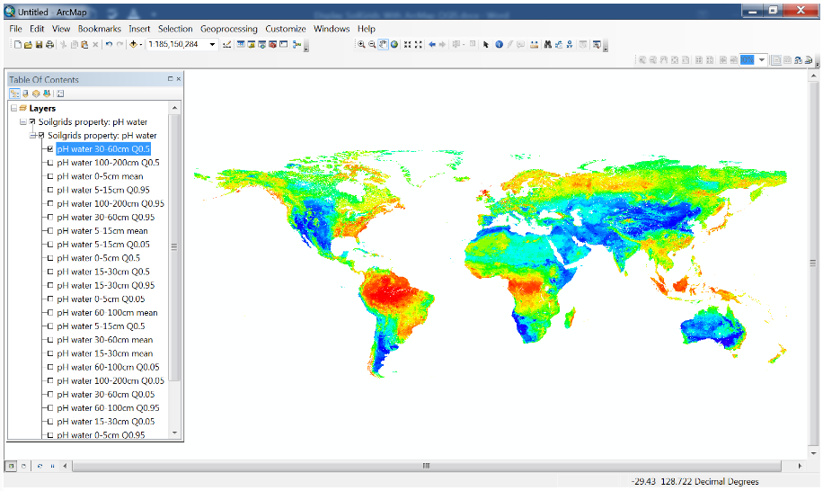 The SoilGrids layers are loaded to Table of Contents within ArcMap/ArcGIS.