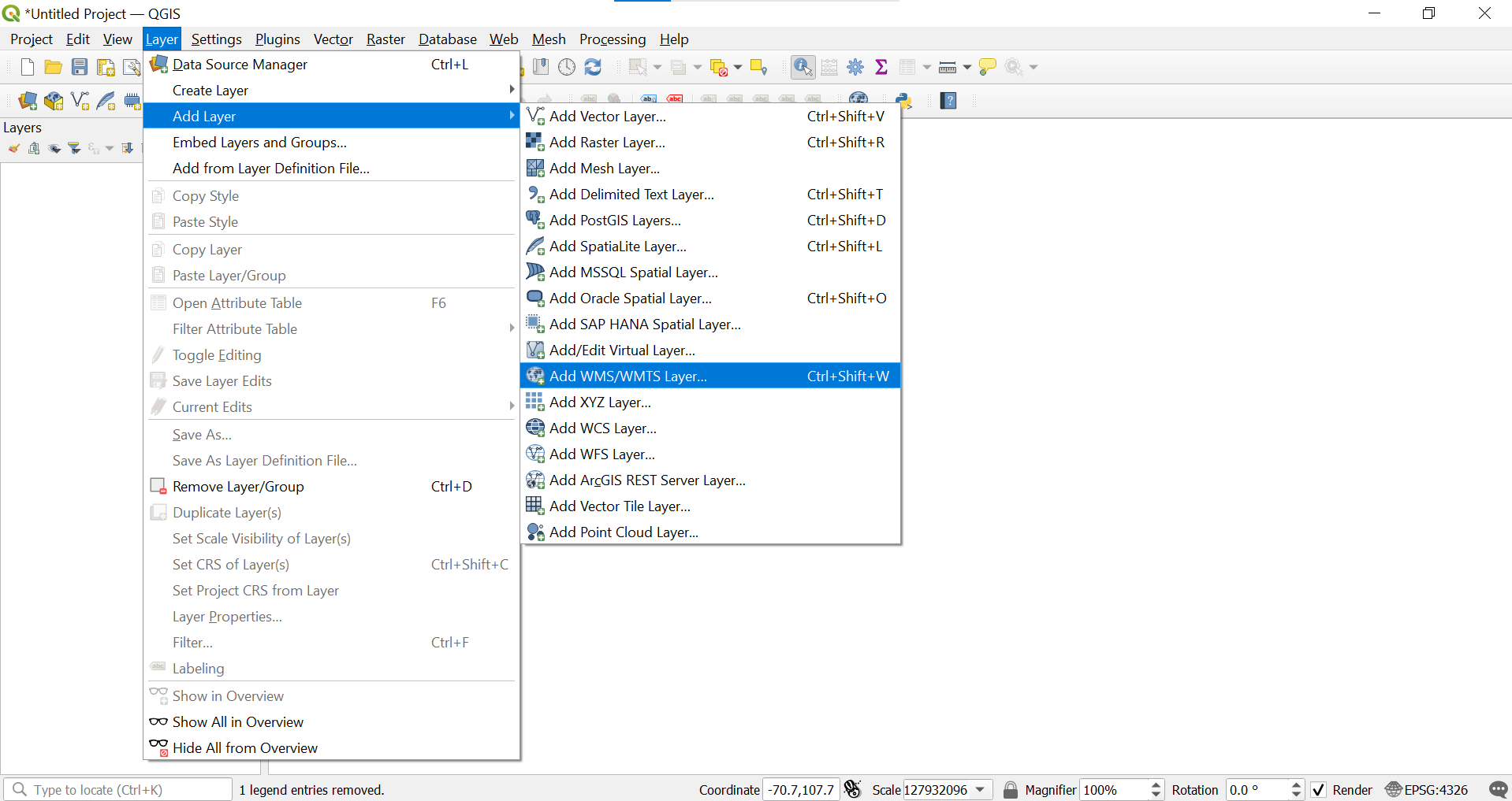 Alternatively select the Layer tab, then hover over Add Layer so that the drop down menu appears and here select WCS.