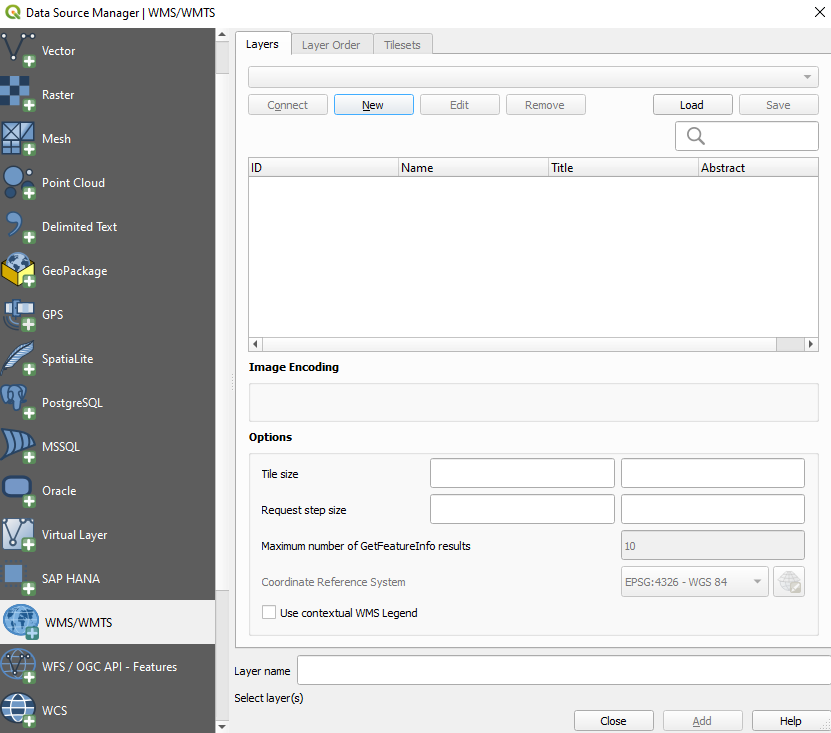 In the Data Source ׀ WMS/WMTS window, click the New button.