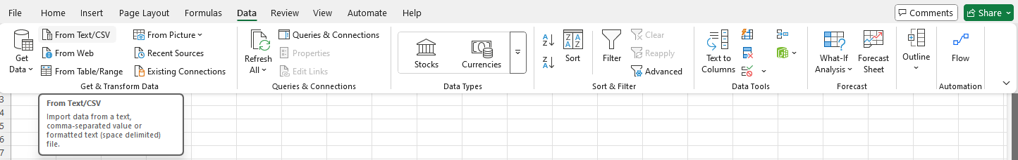 d) Go to the ‘Data’ tab, then select ‘From Text/CSV’ go to the folder where the snapshot files were downloaded.