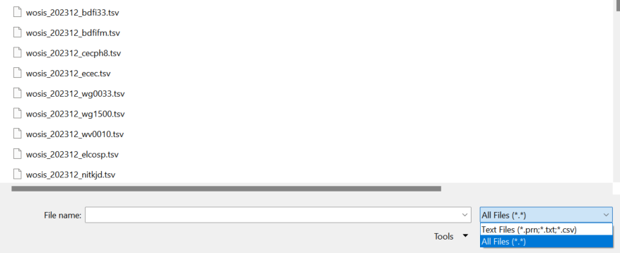 e) Choose option ‘select ’All files (.)’; you will then see a list including the tsv files. Select the tsv datafile to be imported, for example ‘wosis_202312_sites.tsv’. Press ‘import’.