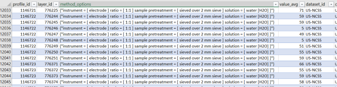 Two text fields in method_options, namely ‘value’ and ‘method_option’, contain complex text strings. There were concatenated from PostgreSQL arrays in WoSIS itself when the snapshot was created. See an example for ‘soil pH’: