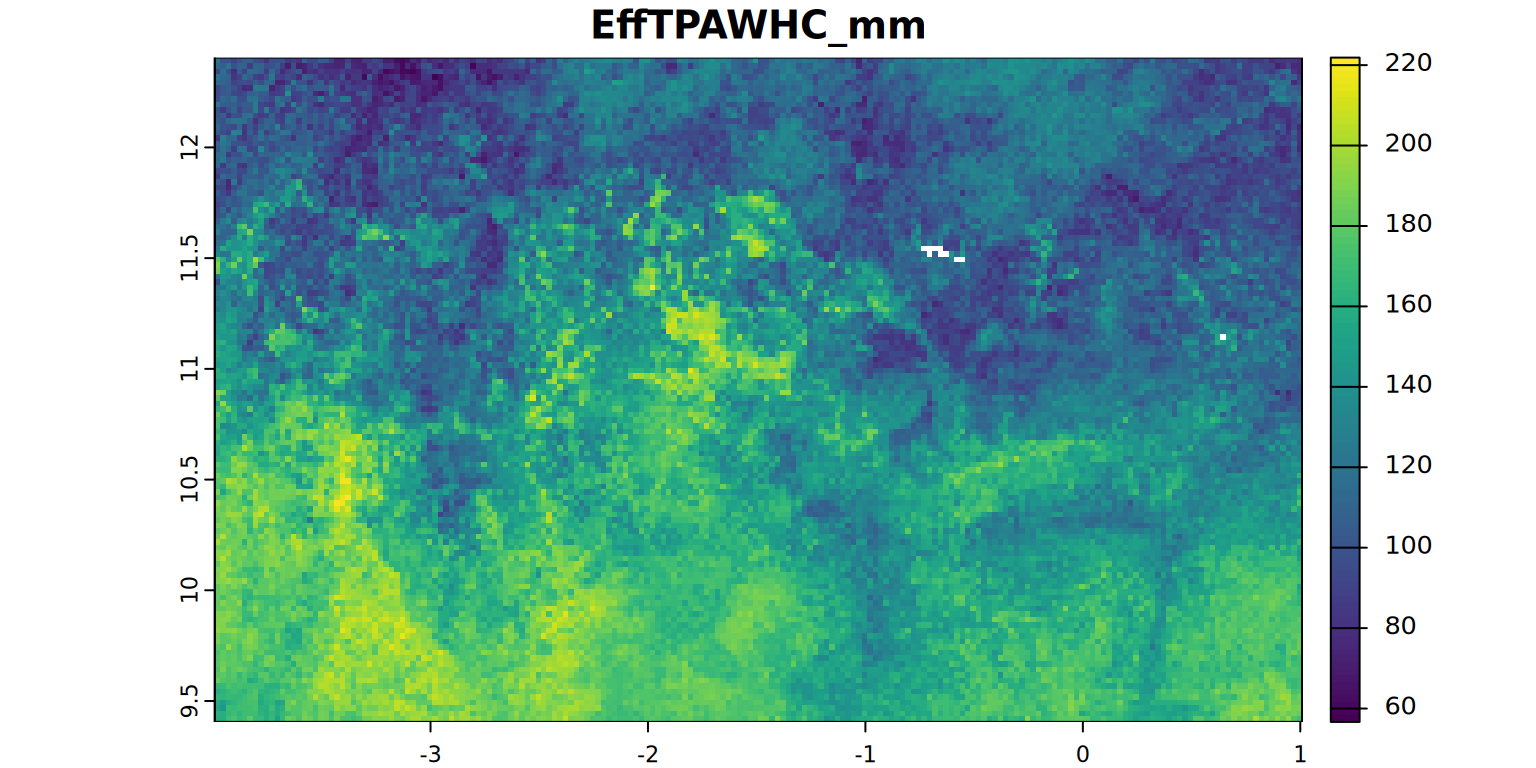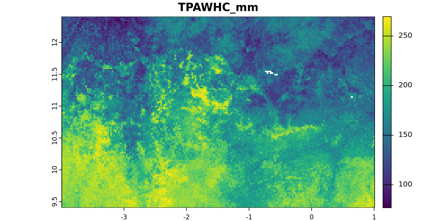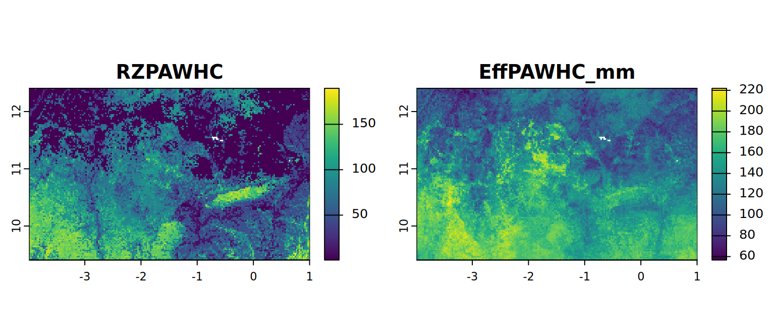 This section reads the input data (maps) required to calculate root zone plant-available soil water holding capacity (RZ-PAWHC) according to the procedure described by Leenaars et al., 2018. These data will be used in Section 2.2 to calculate the effective plant-available water holding capacity of soil depth intervals, and in Section 2.3 to calculate rootable depth and the effective plant-available water holding capacity of the rootable depth.