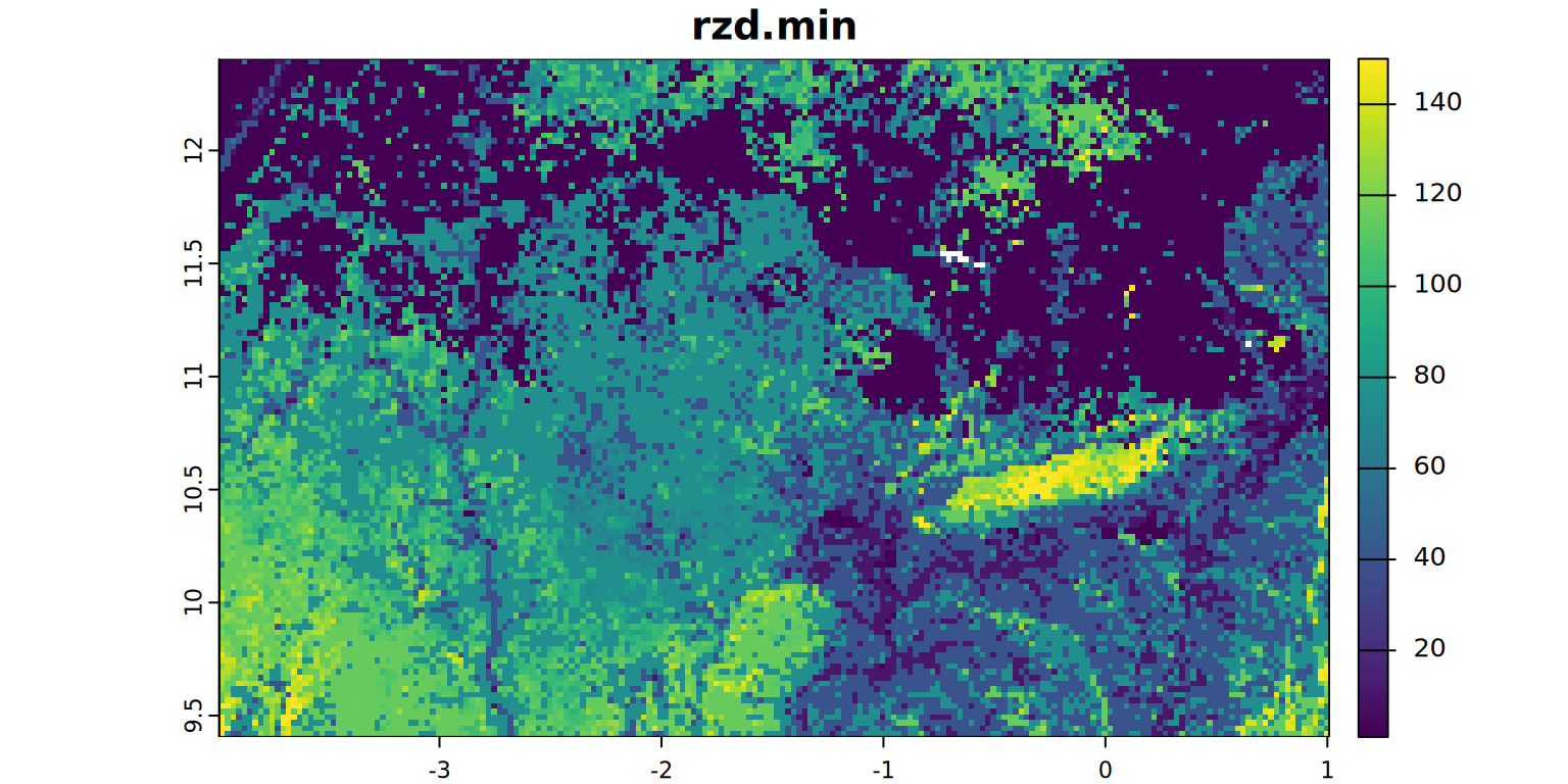RZ-PAWHC is needed for the next section. Here we show how to export an output using the writeRaster() function from terra. Nevertheless, the RZPAWHC.tif is available to the user in the “nutrients” folder. The overwrite, filetype and datatype arguments are optional. Check the writeRaster() documentation here: rdrr.io/cran/terra/writeRaster for more information about the arguments.