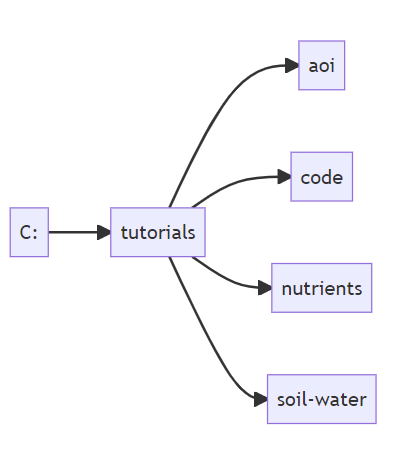 setwd("C:/tutorials/")Note that quotation marks must be used to define the file path. Note further that the soil_water_nutrients folder must not be included in the file path if it follows the folder structure in the flowchart above.